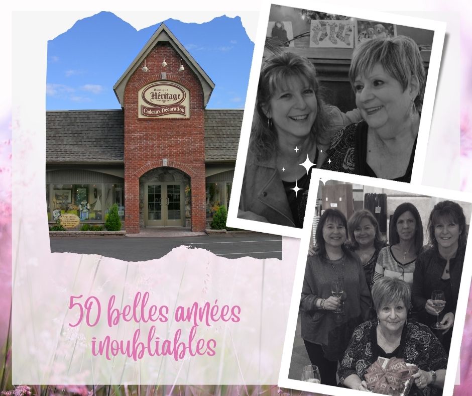 En 1976, Rollande et Réjean Charette réalisent un grand rêve qu’ils chérissaient depuis longtemps. Le 8 septembre, la Boutique Héritage ouvre ses portes et offre alors de l’ameublement haut de gamme ainsi que des accessoires exclusifs de décoration. Par la suite, ils se spécialiseront dans les accessoires de décoration et articles cadeaux. Entre temps, leur fille Suzanne termine ses études en administration des affaires et devient une relève solide pour la prospérité du commerce. Au fil des années, divers produits de qualité tels que des bijoux, des accessoires de cuisine, des produits pour le corps, des articles d’anniversaire et des lampes à l’huile, s’ajoutent à la variété d’objets offerts à la boutique pour satisfaire sa clientèle.
